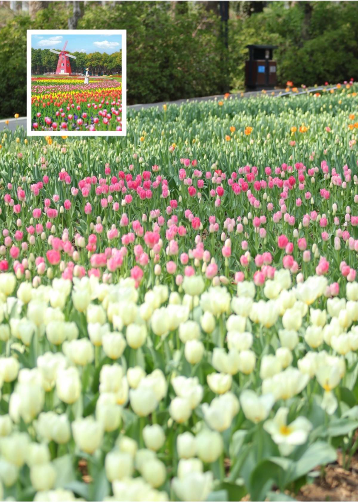 春风拂过,花影摇曳。郁金香主题公园的七彩郁金香田交错铺展,宛如莫奈笔下的花园。古寺与古柏相映,花香与茶香交织,鸟鸣声声,日光斑驳,温柔而静谧。