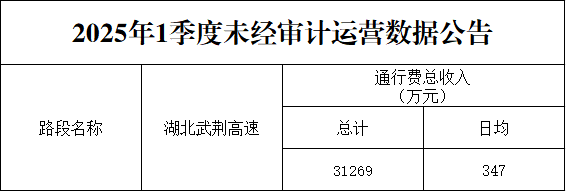 湖北武荆高速公路发展有限公司2025年1季度未经审计运营数据公告