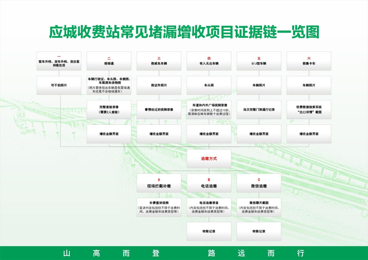 为解决增收业务中证据收集不规范问题,创新编制“3步证据锁链”工作法。一是场景分类,区分假优惠车、假减免车、u/j型车等6类常见情形;二是要素清单,明确每类情形必须采集的3-5项核心证据(如车辆照片、通行详情和视频录像等);三是流程可视化,采用“树状图 图标”形式,确保新员工也能快速掌握。实施后增收业务证据完整率达100%,争议投诉为0,试点收费站月度追缴金额环比增长41.92%。